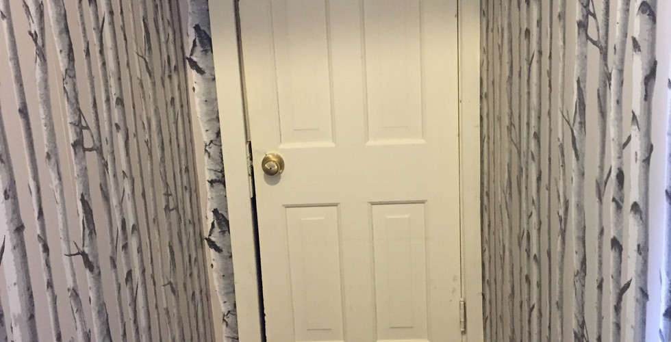 The VERY first thing I had to do when we moved in, even before I unpacked the kitchen, was add wallpaper. Why? Well I had some leftover (score) and It was my favorite thing about our hallway renovation in our last house. I loved it! Of course Mark thought I was crazy, but he never objects. He just kind of goes with it now. Picture of our previous house hallway renovation. Before wallpaper, and After. What do you think?