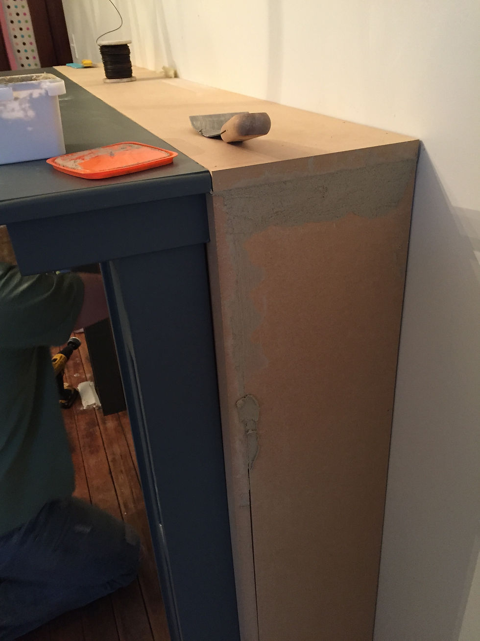 He made a form for the mantle to rest against too, so that if we ever decided to put an electric fire place inset in, the mantle would be far enough out from the wall that we could do that. I was able to put on all the wood filler and now that it's had a day to dry hopefully tomorrow we will get the sanding and the rest of the painting finished.