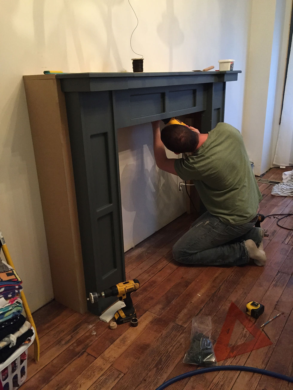 I couldn't wait anymore to finish that project, so I shoved the massive dresser out of the way and moved that mantle over. And what? ..... called the husband upstairs. lol. A lot of "Babe, Please!" 's later, he agreed to help me get this project out of the way.